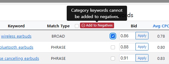 원클릭 제외 키워드 설정: ACOS가 100%를 넘는 등 효율이 떨어지는 키워드가 보이시나요? 그 자리에서 체크박스를 선택하고 '제외 키워드(Negative Keyword)'로 등록하세요. 불필요한 광고비 누수를 즉각적으로 차단할 수 있습니다.