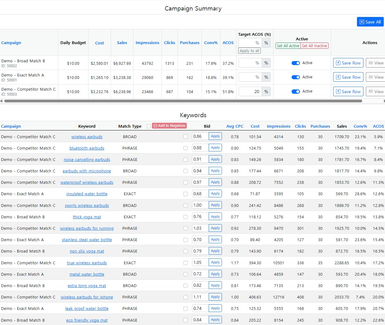 2019년부터 아마존 광고를 운영하면서 정말 불필요하게 반복적으로 해야하는 업무에 대한 피로감을 느꼈고 때때로 그렇기 때문에 광고를 놓기도 했습니다. 손에서 놓는 캠페인들이 생긴다면 관리가 안되고 비효율로 이어져 광고비를 낭비하게 되었습니다. 그래서 개발한 툴이니 대표님들도 아직 사용해보지 않으셨거나 기능이 궁금하시다면 지금 바로 접속하셔서 '데모(Demo)' 버튼을 눌러보십시오.